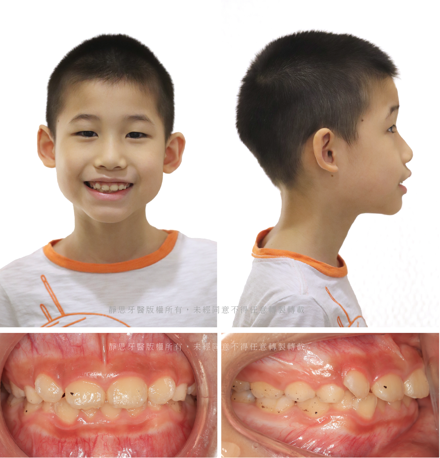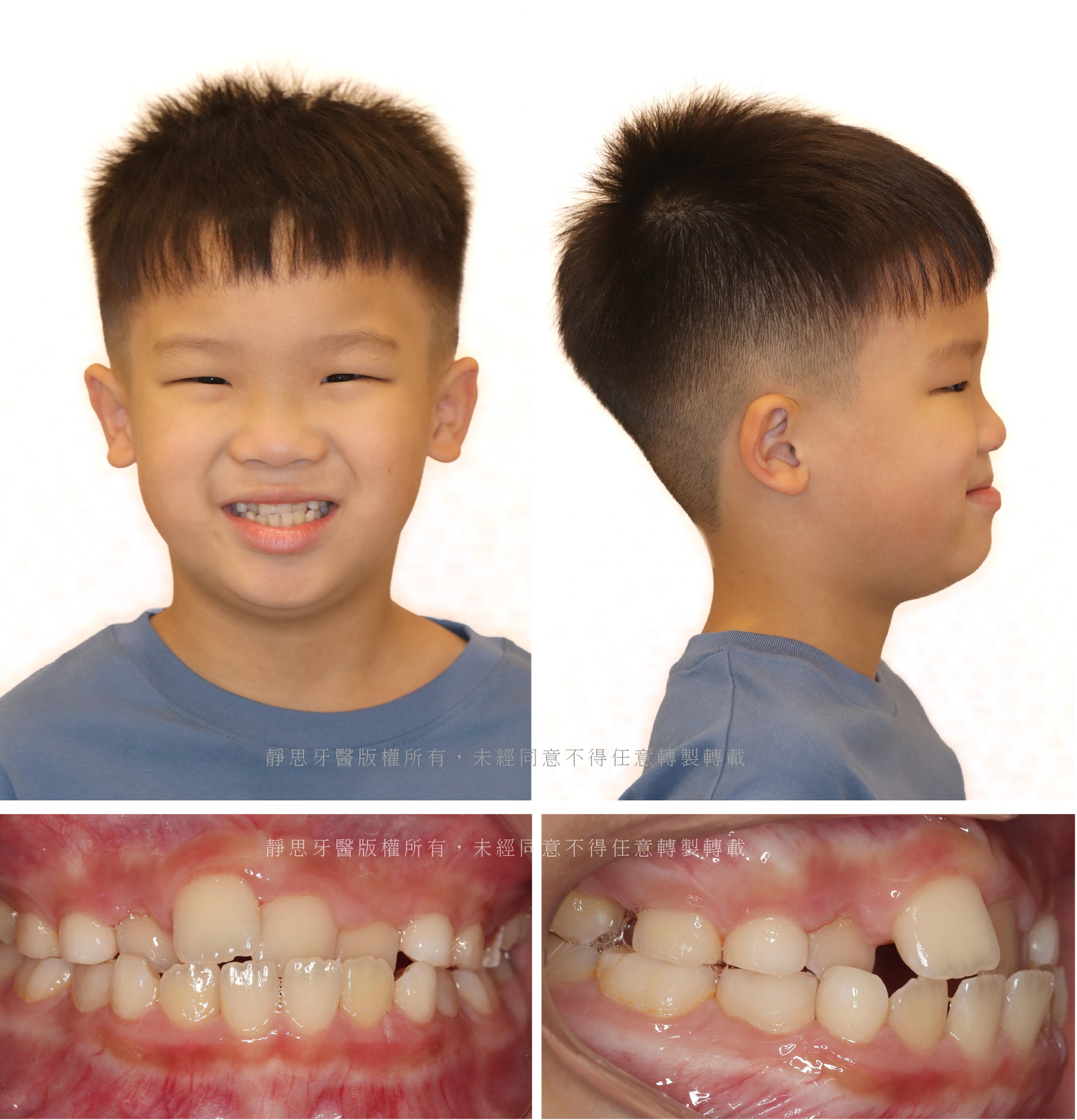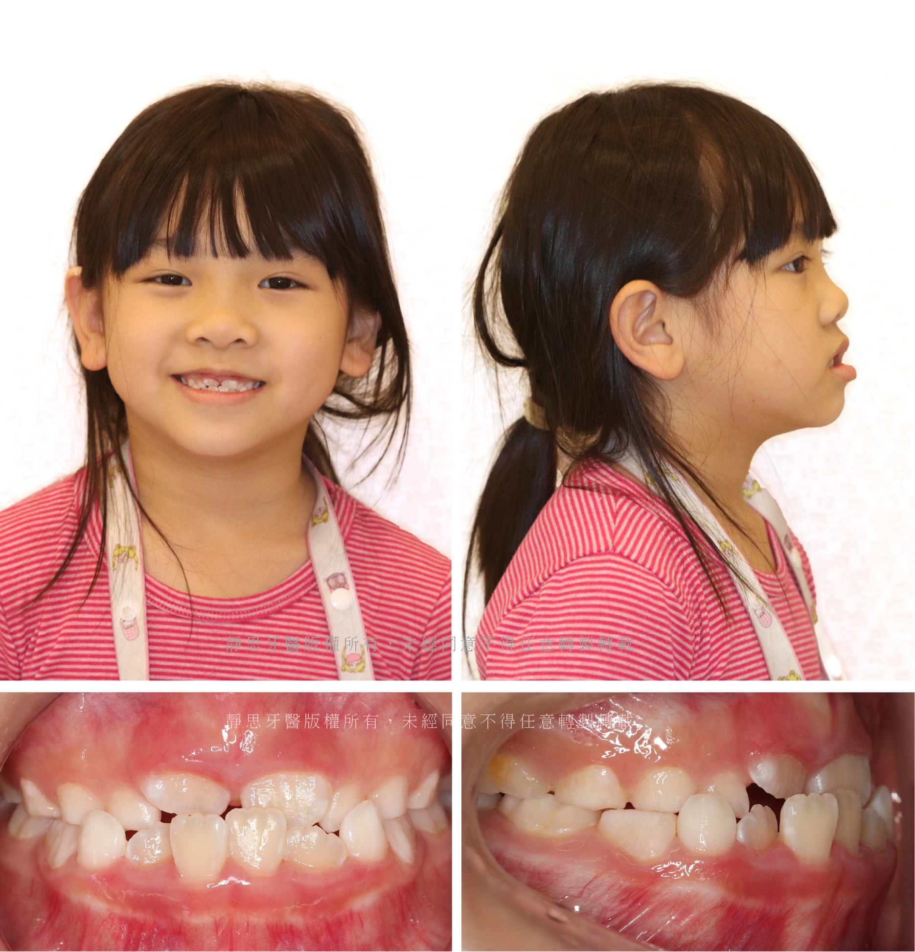 小患者主訴:媽媽覺得孩子發音不清楚、下門牙凌亂、側門牙旋轉、咬合落差大、下巴骨型小、吃飯很慢、睡覺會磨牙,有過敏口呼吸