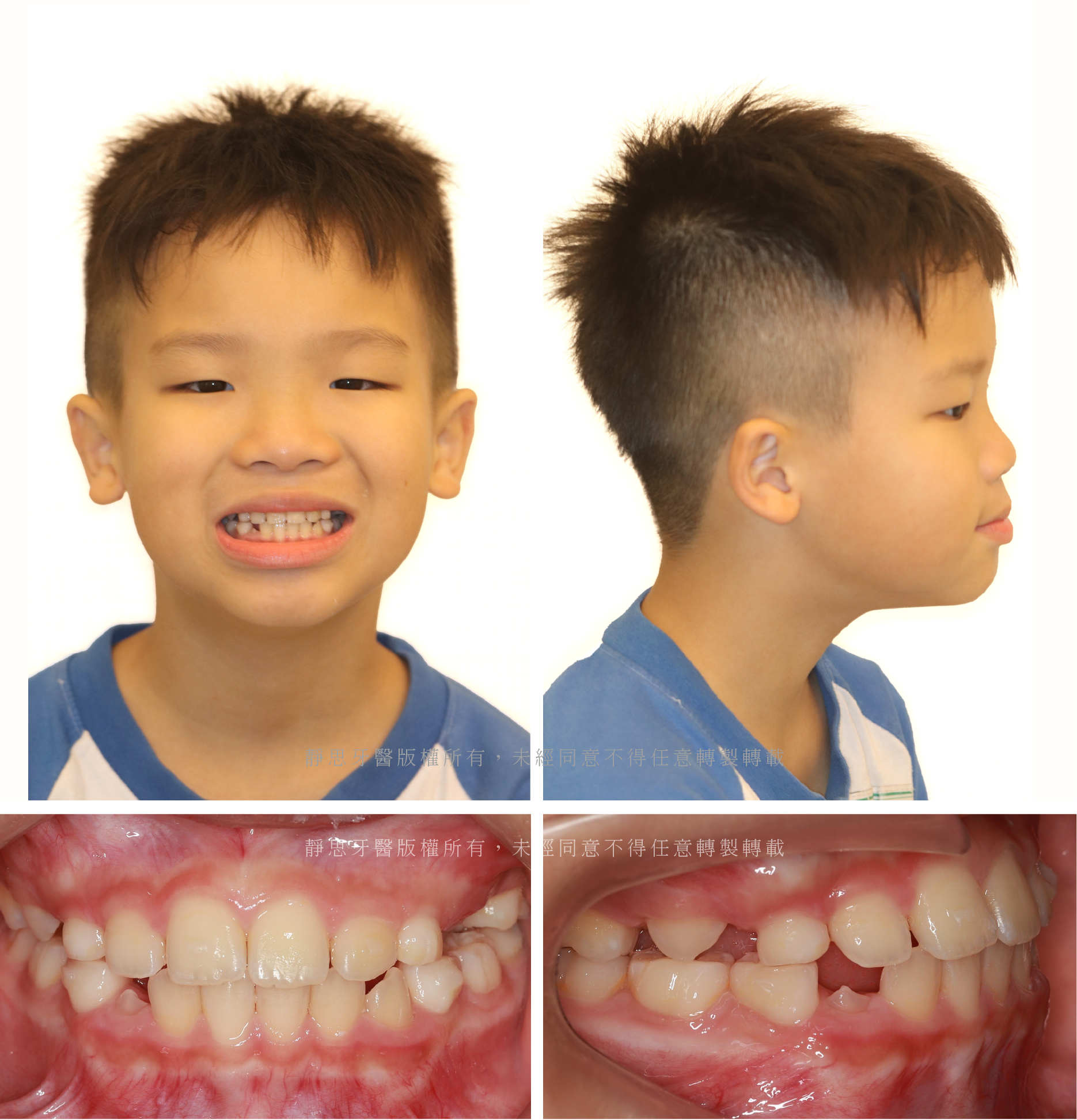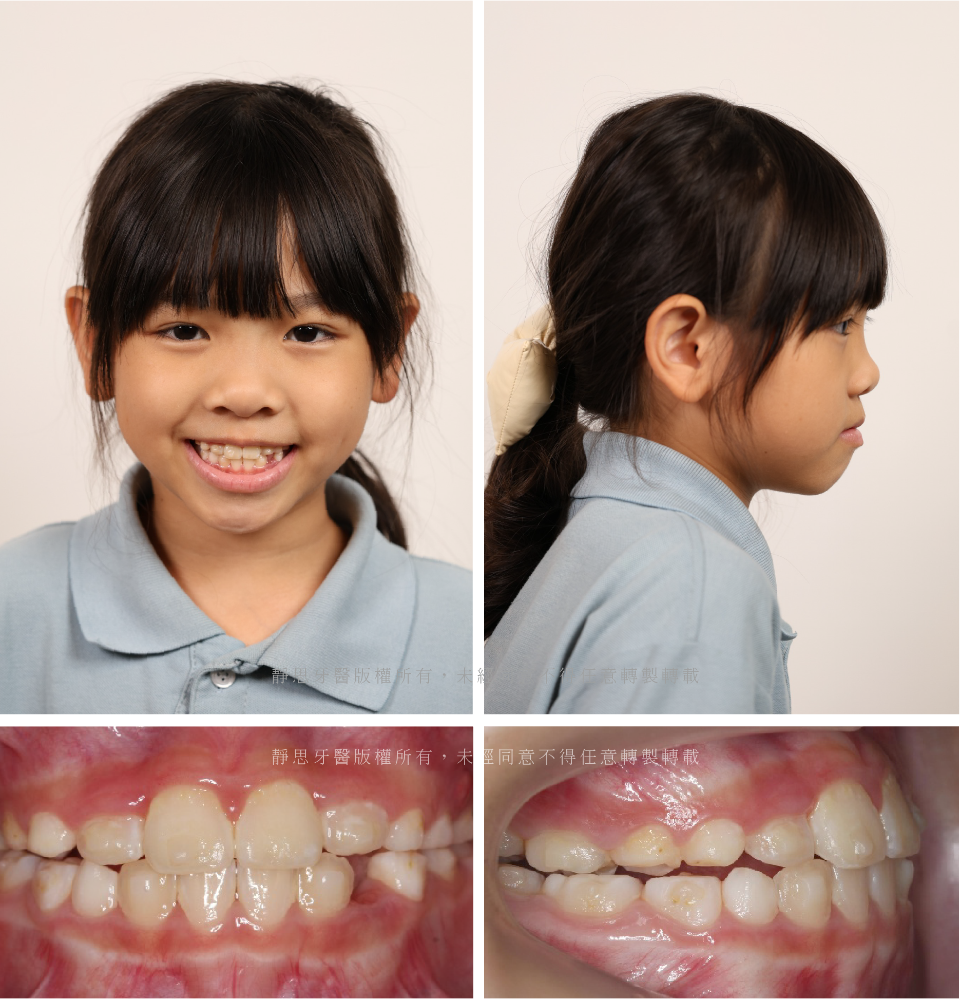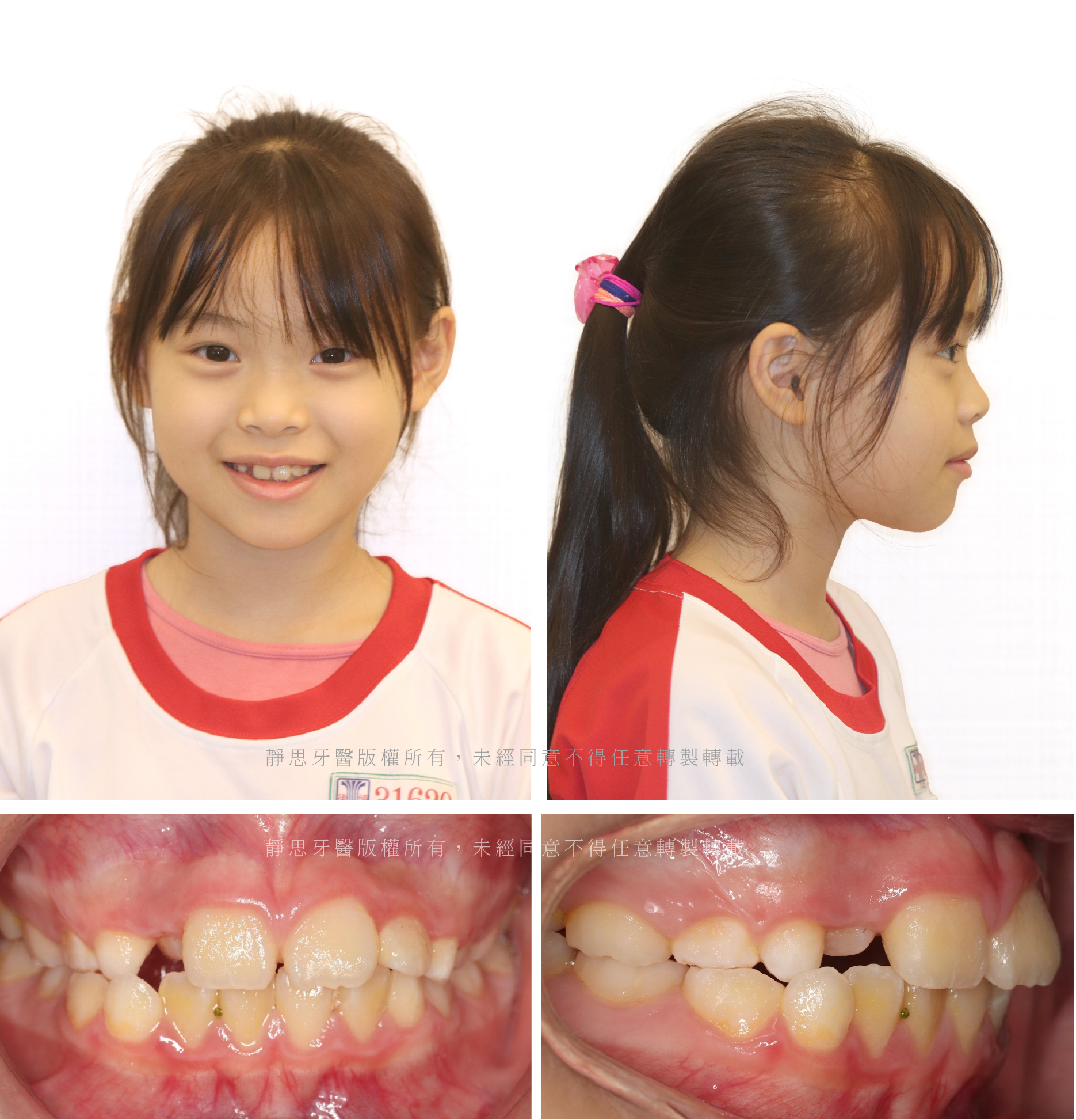 小患者主訴:媽媽覺得孩子發音不清楚、下門牙凌亂、側門牙旋轉、咬合落差大、下巴骨型小、吃飯很慢、睡覺會磨牙,有過敏口呼吸